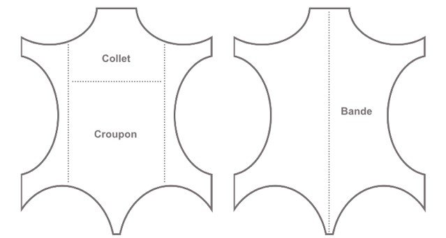 Nous travaillons nos cuirs selon trois découpes principales en fonction de vos projets : croupon, collet et bande.